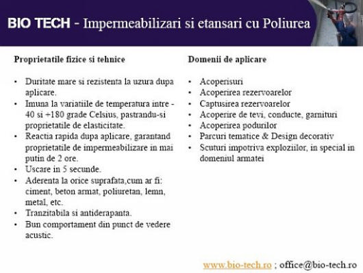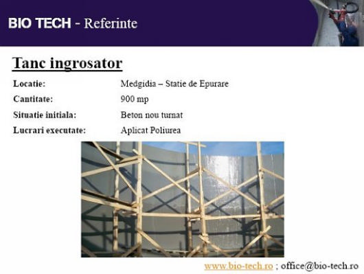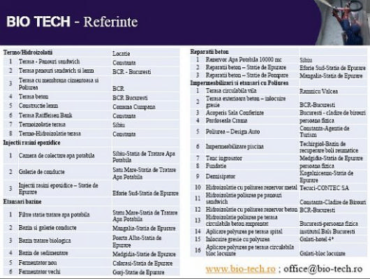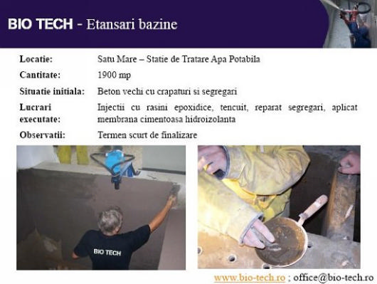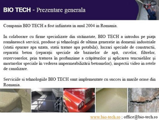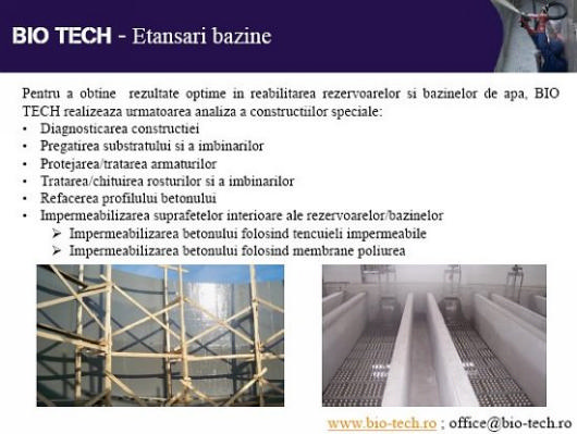 BIO TECH s.r.l. în colaborare cu firme specializate din străinătate, au introdus pe piața românească produsele și tehnologiile necesare reabilitărilor în condiții de siguranță a rezervoarelor și bazinelor stațiilor de epurare și tratare a apei compania deținând certificate de
